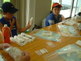 今年は蝶・せみ・トンボが少なく標本づくりが心配されましたが、ナナフシ、カワラバッタ、ウバタマムシ、コオニヤンマなどが採取でき、午後は各自が採った昆虫の標本づくりをしました。その後、ホタルの発光実験を体験して、参加者に本会顧問の佐藤馨先生から黒メダカの稚魚がプレゼントされました。