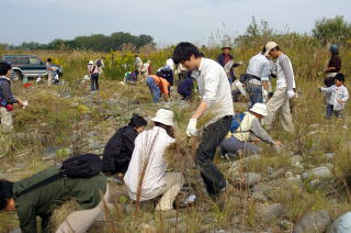 午前中は河川敷に咲くカワラノギクを観察し、シナダレスズメガヤやセイタカアワダチソウを駆除する作業を行いました。昼食はさくら市ミュージアムの「みんなの広場」で芋煮会を開催し、午後は東京大学の鷲谷教授を囲んで情報交換など、楽しい1日を過ごしました。