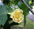 桜野の運動公園内にある「ユリノキ」がチューリップのような花を咲かせています。ふつうは、木の上の方で咲くので見られませんが、運動公園のは、手が届くところで咲いています。