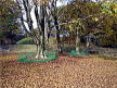 国蝶のオオムラサキの幼虫が越冬するため、落ち葉が北風で飛ばされないようにエノキの根元にネットを張りました。勝山の森も木々の紅葉があざやかで、冬間近を感じさせていました。