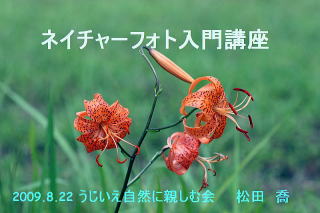 さくら市ミュージアム講座室で、副会長松田喬さんを講師に、9名が参加して開かれました。朝の大雨で心配されましたが、10時には太陽が出てほっとしました。松田さんからは、カメラの絞りやシャッタースピードについてと最新のデジタルカメラ情報。そして、実際の写真を見ながら撮影時の様子を聞きました。特に、コオニユリの撮影は、条件を替えて写したり、ハンミョウの足の毛まではっきり撮影されていたのには、参加者一同驚きました。