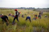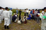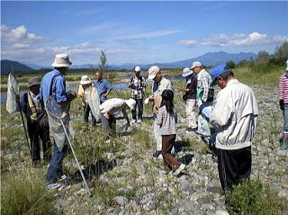 宇都宮市環境学習センター主催の環境大学「鬼怒川再考」の現地学習会が開かれました。受講生40名は、東京大学カワラノギク実験地のシナダレスズメガヤについて、加藤会長が説明をしてから抜き取りの体験をしました。