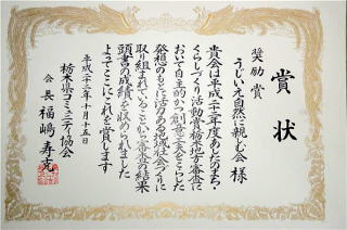 栃木県コミュニティ協会・栃木県生活学校連絡協議会・財団法人あしたの日本を創る協会主催の「あしたのまち・くらしづくり活動賞」で、本会は、日頃の自然保全活動が認められ、「奨励賞」を受賞しました。