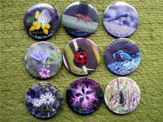 副会長の松田喬さんが撮影した生態写真で缶バッジを作りました。昆虫(シルビアシジミ・アカガネネクイハムシ・ミヤマシジミ・キバネツノトンボ・アイヌテントウ)、植物(カワラノギク・カワラナデシコ)、野鳥(セグロセキレイ・カワセミ)の9種類です。