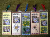 国土交通省下館河川事務所氏家出張所では、鬼怒川河川敷にいる動植物10種類(カワラノギク、ミヤコグサ、カワラニガナ、オキナグサ、カワラナデシコ、シルビアシジミ、ミヤマシジミ、ツマグロキチョウ、カワラバッタ、カワセミ)の写真等で5枚のきれいな「しおり」を作りました。