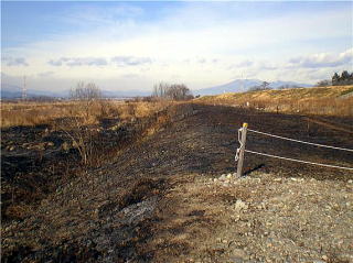 東京大学カワラノギク実験地南西より野火が発生しました。火は、南風にあおられて、カワラノギク実験地の約4分の1程度の草などを焼き尽くしました。