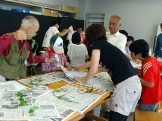 田代先生が準備した「押葉標本のつくり方」を参考に、ミュージアム周辺の「クサノオウ」「コヒルガオ」「ヒメジョン」「ヨウシュヤマゴボウ」などの植物を採集して、標本作りを学習しました。参加者は6家族と本会の会員など22名でした。