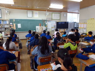 さくら市立上松山小学校(南部正人校長)4年生(62名)へ、加藤会長が出前授業「鬼怒川の自然環境について」を行いました。 「シナダレスズメガヤ」の実物や「シルビアシジミ」、「ミヤコグサ」、「カワラノギク」の標本やパンフレット「れき河原の自然を守る」と「本会のパンフレット」を見ながらの授業でした。