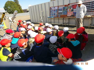 さくら市立氏家小学校(橋本啓二校長)3年生147名へ理科の授業「太陽の動き」の出前授業を校庭で行いました。 講師は菊地庸夫理事が務め、「太陽の大きさ」、「太陽の表面温度」、「太陽の光が地球に届く時間」、「北極星の光が地球に届く時間」などの説明を、自作のパネルを使ってわかりやすく話し、天体望遠鏡で太陽表面の黒点を観察しました。