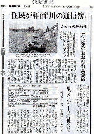 国土交通省が5年ごとに実施している、鬼怒川とゆうゆうパークについての市民の感想を聞き取るアンケート(15項目をチェック)に、8名が参加して協力しました。この日の様子は読売新聞8月26日発行の33面栃木版に掲載されました。