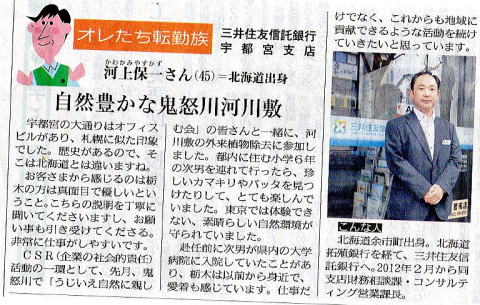 下野新聞26年11月9日(日)発行、21面地域「まちなか支局」の「オレたち転勤族」に掲載された記事です。河上保一さんは、本会の10月12日の行事にお子さんと初めて参加された際の感想を投稿されたものです。「今後の行事にも参加してみたい。」とうれしいコメントがありました。