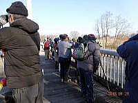 早朝の寒さはどこへやら、北風も吹かず穏やかな探鳥会となり、開始早々に「カラ類(シジュウカラ、コガラ、エナガなど)」を観察し、幸先の良さを感じました。吊り橋の上からは「カワセミ」と「カイツブリ」をしっかり観察出来ました。