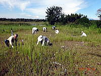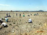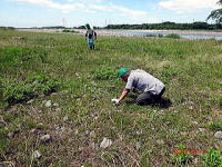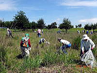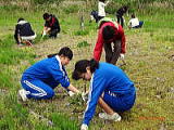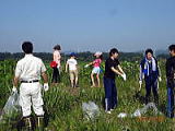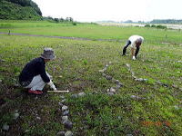 こ ツバメが飛び交う鬼怒川河川敷でシナダレスズメガヤ、オオフタバムグラ、メマツヨイグサなどの抜き取り作業とカワラノギクの種まきをしました。さわやかな風と5組の親子連れにユースボランティアの中学生、宇都宮白楊高等学校生物工学科の高校生などが多数参加して、作業は終始和やかな雰囲気で行われました。