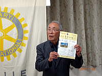 さくら市のホテル清水荘で「氏家ロータリークラブ」(手塚慎一会長)の11月例会があり、加藤会長が10月8日の「シナダレスズメガヤの抜き取り作業とカワラノギク観察会」参加のお礼と、「鬼怒川の生物多様性を守る活動」と題して、日頃の活動について実物や写真とパワーポイントを使って発表しました。終了後に手塚会長より活動資金をいただきました。ありがとうございました。その後に「氏家ロータリークラブの会報」を戴きましたが、4面に活動の写真とカワラノギクの写真が掲載されましたので紹介しておきます。